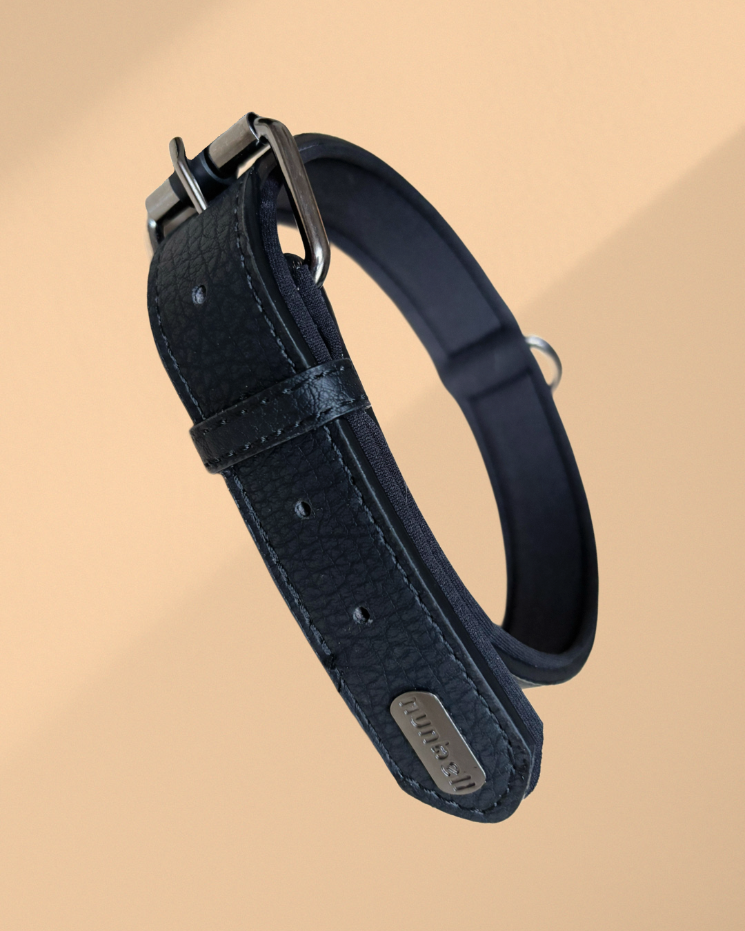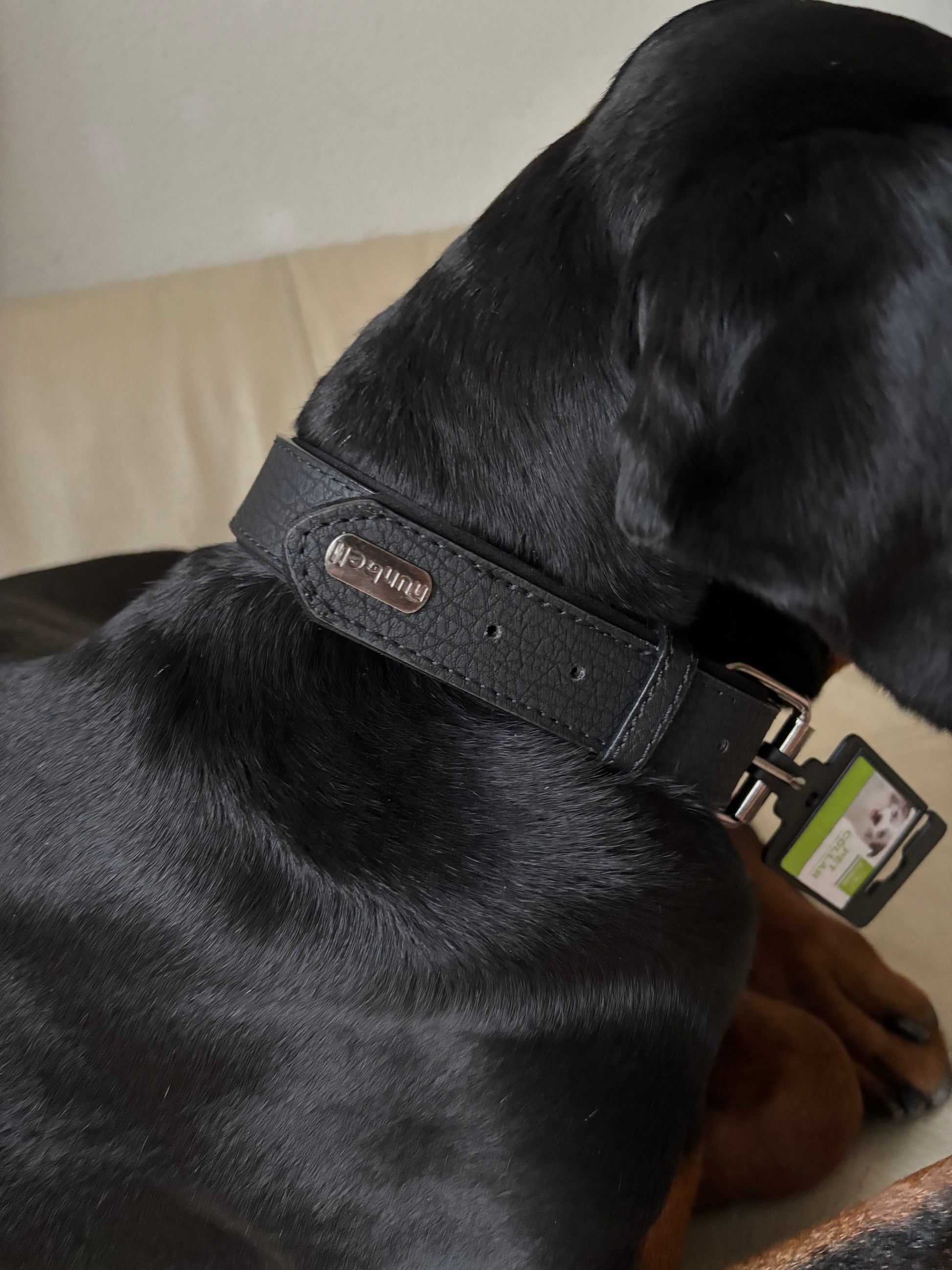 Polstrovaný lehoučký obojek dlouhý 65cm a široký 3cm. Dírky 45cm az 55cm.