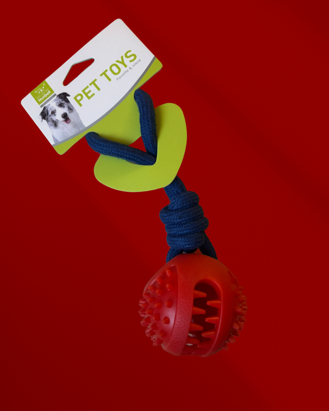 Přetahovací hračka s gumovým míčkem na čištění zoubků dlouhá 20cm.